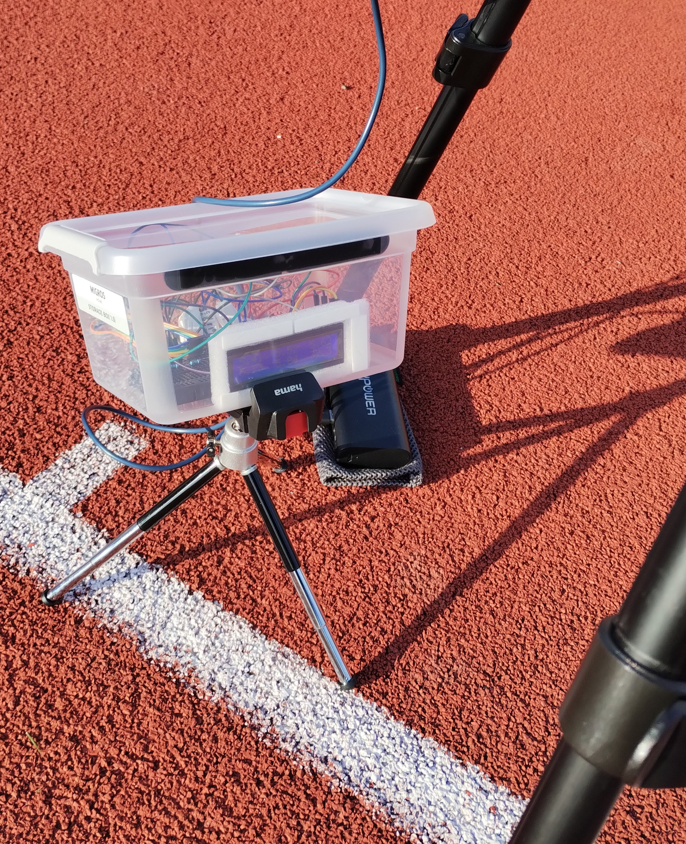 Dopo aver fatto numerose prove, son giunto ad una configurazione perfettamente funzionante anche per la massima distanza punto-punto in una pista d'atletica, cioè la diagonale che va dal traguardo alla partenza dei 200m. Nel mio caso, il modulo trasmettitore è stato poggiato a terra, mentre il modulo arrivo sta in cima al treppiede, quindi a circa 1.80m.