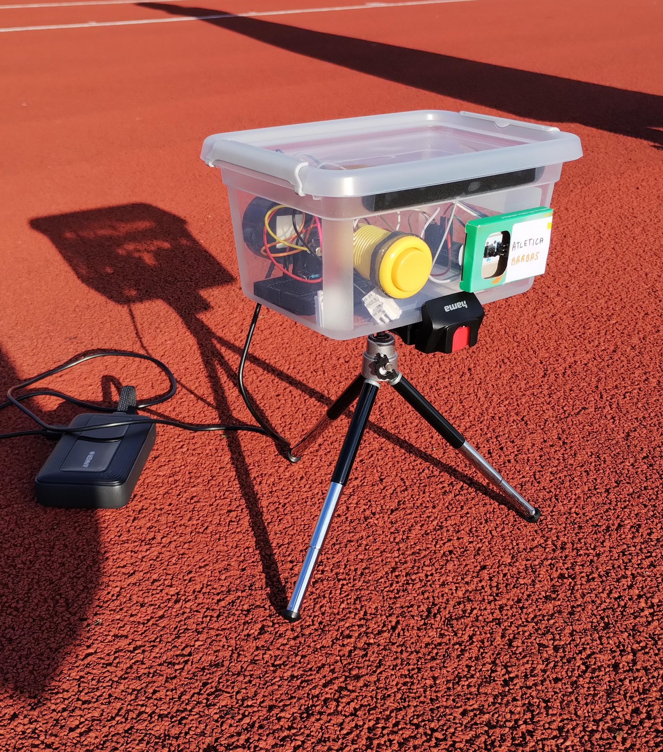 The yellow button gives the start directly, in the case there is another person around. The little button gives the "on your marks" command. After 10 seconds, another beep gives the "set", and after a random interval of 2.5 s - 4 s, the final "beep" is the actual start! Of course the duration of the intervals can be changed from the code.